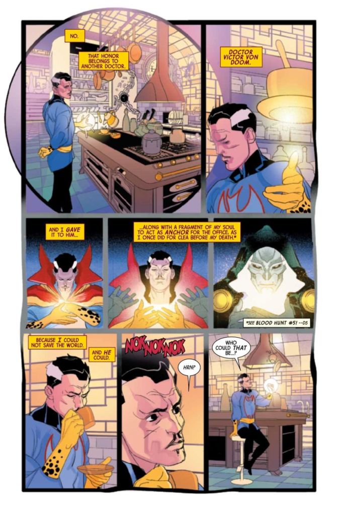 When last we left Stephen and Clea Strange in Blood Hunt #5, Stephen accepted a deal with Doctor Doom to turn over the mantle of Sorcerer Supreme because only Doom had the resources at his disposal to dispel the Darkforce energy enveloping the world in darkness. Stephen only accepted with the condition that Doom would return the mantle after the world was saved. Sadly, Jed MacKay’s version of Doctor Strange is too dumb not to notice the loophole in that verbal agreement.