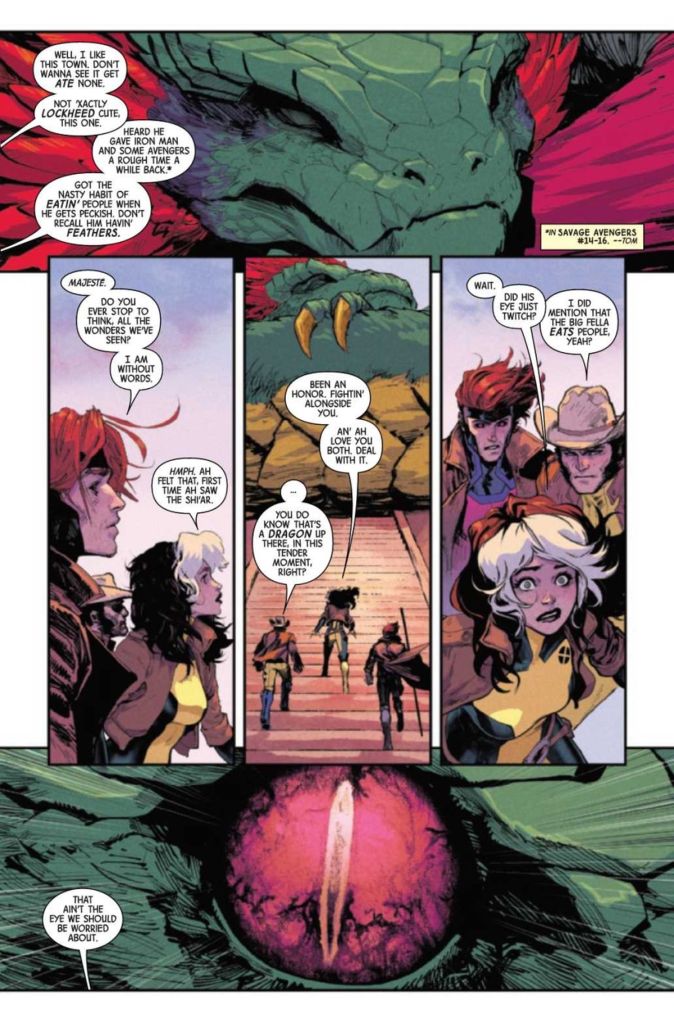 The trio meets outside Mexico City to fight a Quetzalcoatl-ish dragon named Sadurang, who recently appeared in Savage Avengers #14-16. With a brief bit of fighting (the only action in the comic), Gambit dislodges an Eye of Agamotto embedded in the dragon’s chest and threatens to destroy the Eye if the dragon doesn’t go to Antarctica for a year to cool off. Before the dragon leaves, it foretells a dark force on the move by using the name “Endling.”
