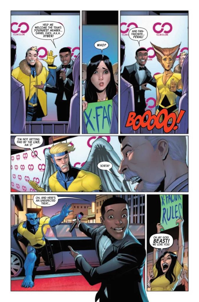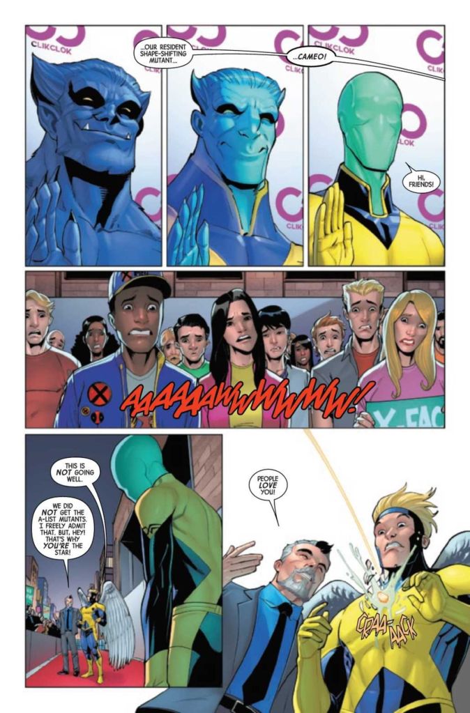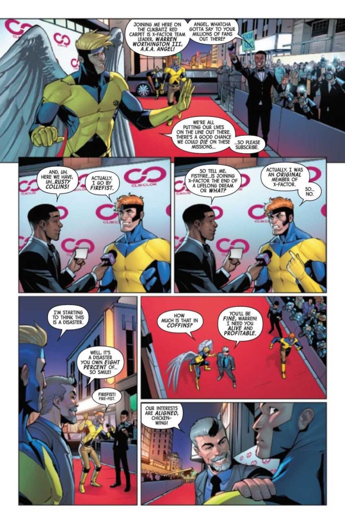 During a red carpet stroll by the latest X-Factor team, sponsored by ClikClok, team leader Angel quietly expresses his misgivings to Broderick about the team’s lineup and the pubic ire so soon after the downfall of Krakoa. Between Broderick’s ceaseless spin-doctoring and the wildly over-the-top reactions on both sides of the carpet to boos and protests, the team’s public introduction is a disaster.