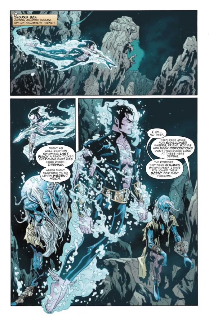 The comic shifts to King Attuma, who rallies his soldiers to find and kill Namor as the cause of all their problems. In an admittedly badass move, Namor casually swims into the middle of the rally and challenges Attuma to ritual combat, called the Crimson Swim, to settle their differences. Attuma agrees to the challenge.