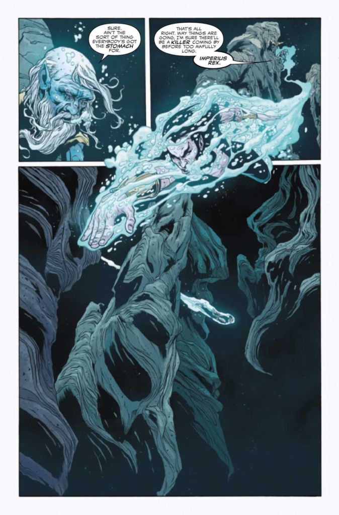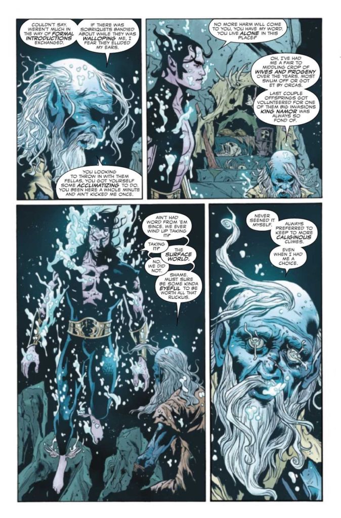 In Namor #2, the newly freed but former King of Atlantis swims through the open oceans to assess the damage his absence has brought. He first encounters a blind old man who laments the loss of food, family, and any means of survival at the hands of scavengers. When Namor offers to provide aid, the old man asks for nothing but a swift death, a gift Namor is unable to give.
