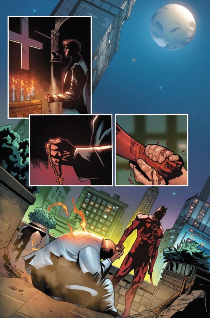 Later, Patrice shows up at St. Nick’s with a gun to find Father Javi badly injured. Daredevil shows up soon after and is horrified by Father Javi’s condition. He tells Patrice to get Father Javi to a hospital while Daredevil searches Hell’s Kitchen for Jason.