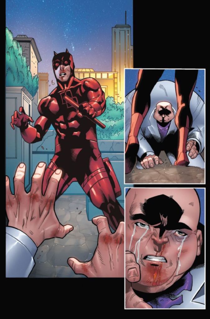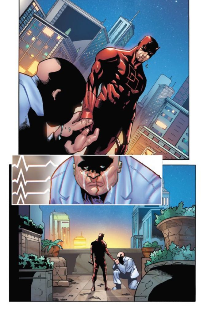 In Daredevil #13, Matt Murdock, aka Daredevil, becomes overwhelmed by the sincerity of Wilson Fisk’s pleas for forgiveness and absolution. Matt doesn’t believe the sincerity in Fisk’s begging can overcome Matt’s lack of faith in himself to grant the request, so he flees.