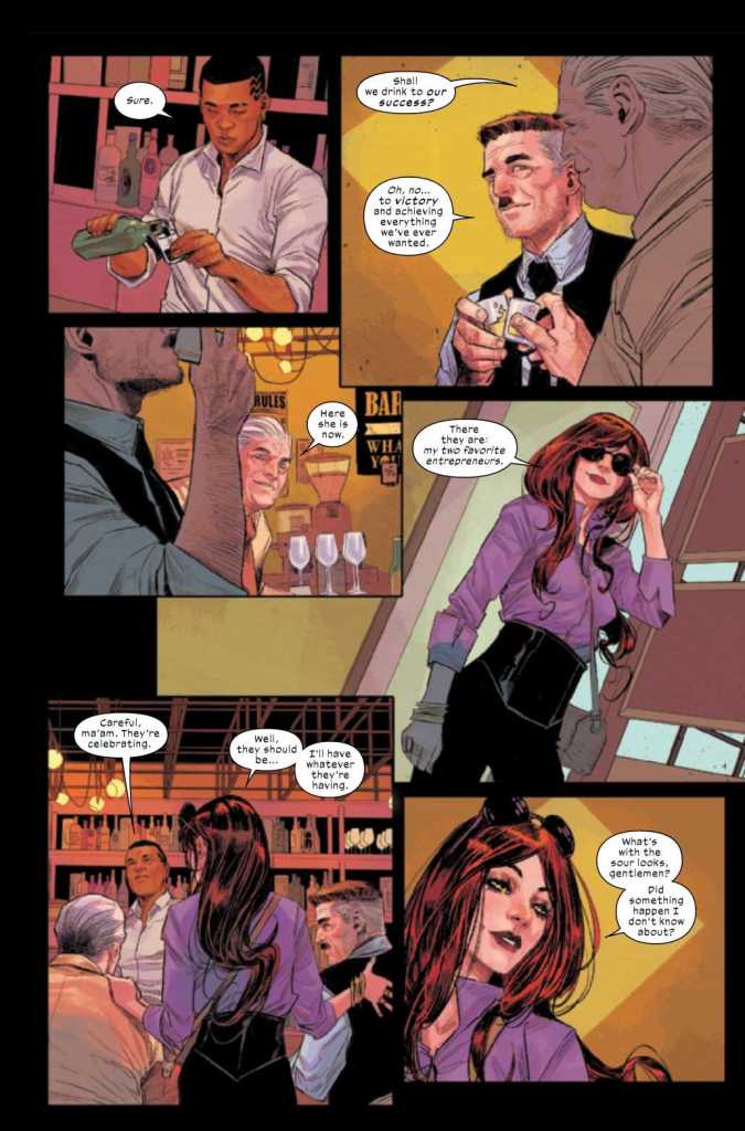 Opening the issue with this scene has several interesting but odd tidbits. Why would a pair of senior, seasoned news professionals not understand how marketing and reader analytics work? Tracking numbers is the air publishers breathe (if they want to be successful), so why would M.J. need to show them the ropes? Further, it’s highly ironic that Marvel has a comic showing how important it is to build and bolster reader engagement in an era where Marvel’s engagement with its readership is probably the lowest in history. Lastly, M.J.’s eyes through this entire sequence are golden yellow, which could be an artifact of the digital copy we received or maybe something else.