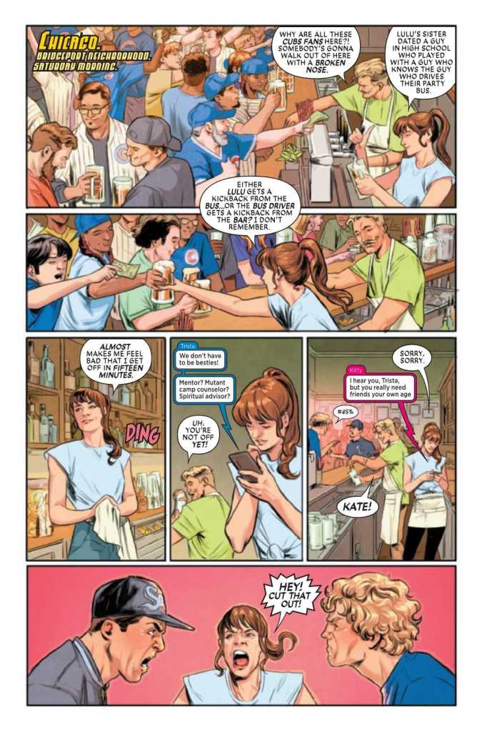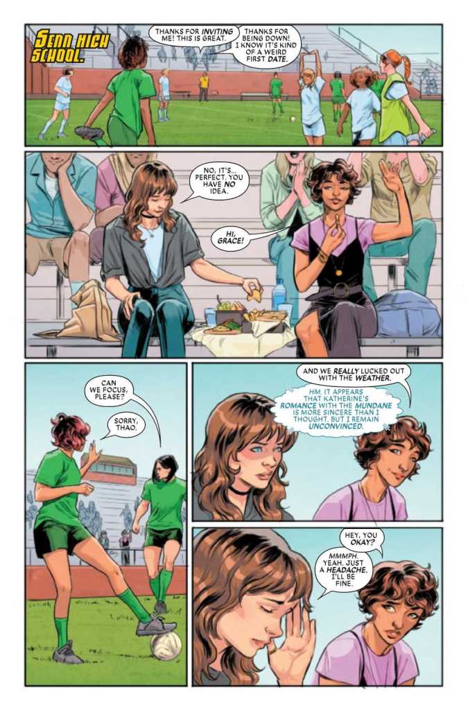 In Exceptional X-Men #2, Kitty desperately pushes to live out the most mundane life possible by tending bar at Lulu’s Tavern, going on dates, and intentionally choosing every non-unusual choice whenever possible. Kitty misremembered the timing of her date in issue #1, but she has a second chance by attending a high school soccer game with her romantic interest, Nina, to watch Nina’s little cousin play.