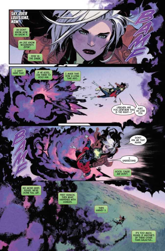 Immediately, you’re smacked in the face with confusing questions. Why is Logan dying from a physical attack? His healing factor has overcome much worse with ease. Why did Rogue need Nightcrawler to BAMF/fly her to Logan’s location? He’s still in the general area, and Rogue can fly at least as fast as Captain Marvel. How does Rogue have a psychic link to Logan? Questions are a good thing if they fill in pieces of a mystery, but not so much if they keep you rooted in the past events of a story because they’re confusing.