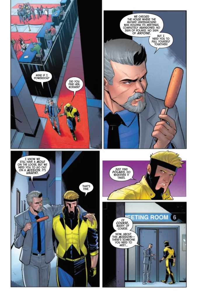 In X-Factor #3, X-Factor attends a fan expo to sign autographs and pose for photo ops. Rodger, the team’s manager, pulls Havok aside for a pep talk since Havok uncomfortably mopes over losing Polaris. Rodger uses the backstage conversation to get Havok briefed for his next mission.