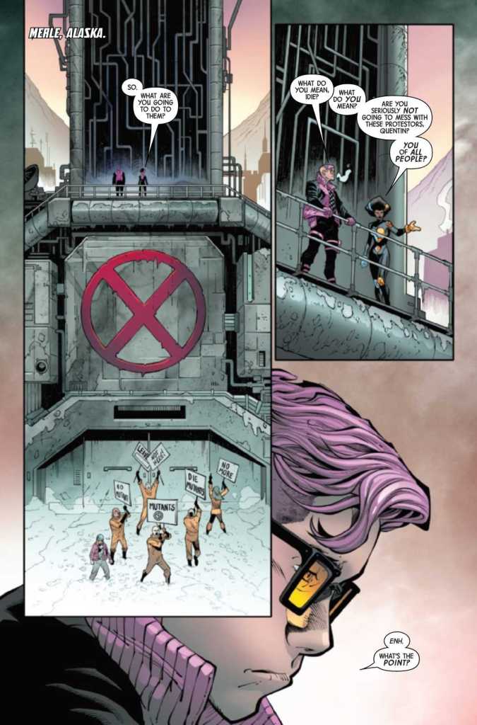 In X-Men #6, Temper and Quentin Quire, aka Kid Omega, dully watch a group of protestors outside the Factory, locals who want the mutants gone. Temper suggests Quentin use his psychic protestors to drive them away, but Quentin doesn’t see the point. Before the duo heads inside to attend a meeting chaired by Beast, Temper notices one of the young girls in the protest group giving her the secret mutant gang sign.