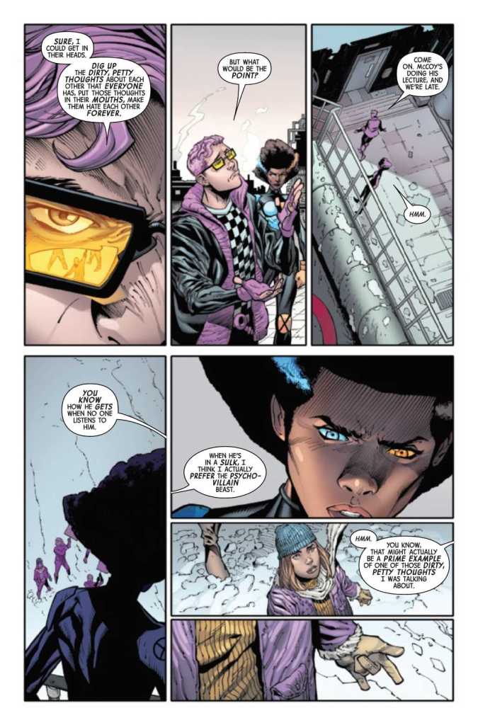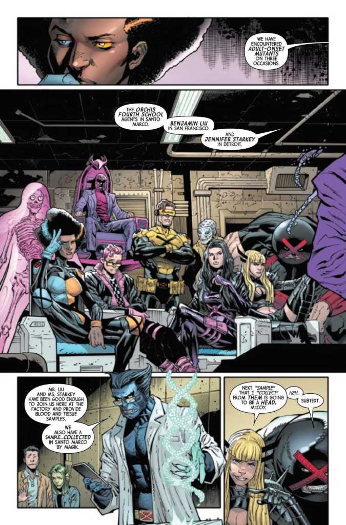 Inside, Beast provides everyone with an update on his research into what he calls adult-onset mutants. The mutation is not the result of a virus, as some online rumors would have people believe. Ben Liu and Jennifer Starkey, who are temporarily staying at the Factory for want of somewhere to go, are victims of forced experimentation. Hank doesn’t know how or why Ben and Jennifer were released into the wild by the group they now know is named 3K. The likely scenario is that the mutation didn’t present immediately, so 3K released them after presuming the experiment failed.