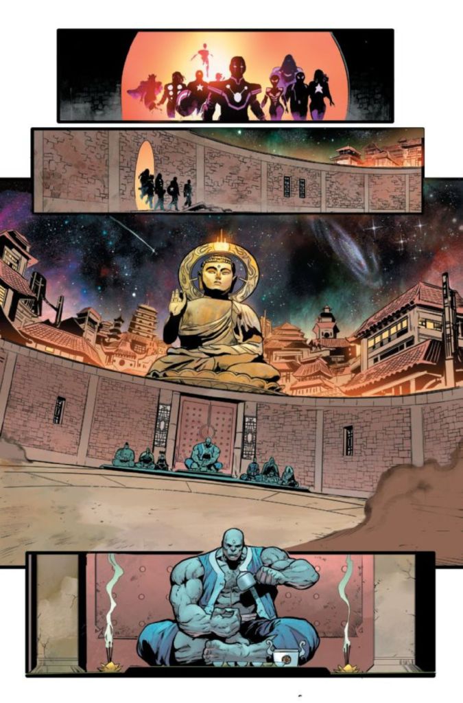 The doorway magically seals behind the Avengers. Without an obvious path to escape Hulk’s trap, they have no choice but to fight. Unfortunately, Hulk is not alone. He has a cadre of spiritual disciples with him, and they each inject themselves with Hulk-out serum to turn them into a team of Hulk-strong martial arts masters.