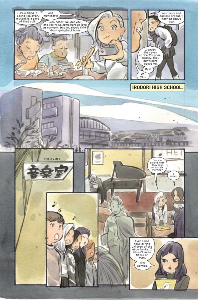 In Ultimate X-Men #9, we begin with a day in the life of the students at Irodori High School. Knowledge of the Children of the Atom cult spreads like wildfire among parents, teachers, and students. Hisako and her friends are (accurately) suspected of being mutants, so some of the mean girls at school taunt and insult them, prompting Hisako to tear down a festival display in anger.