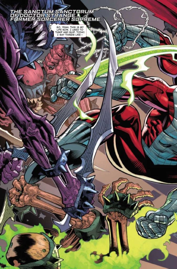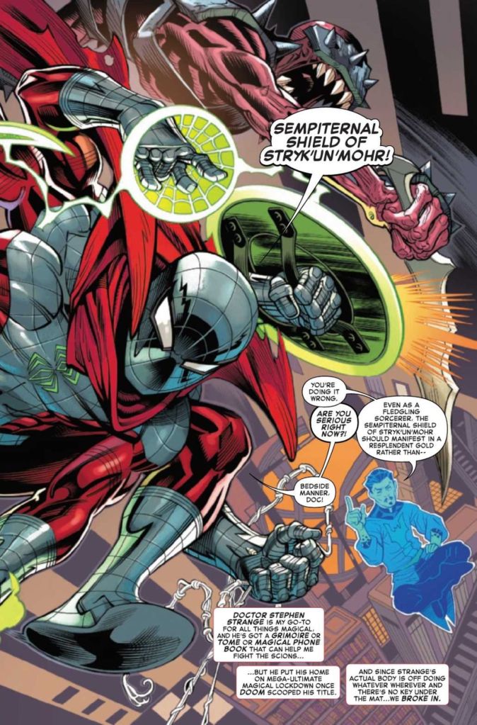 “Huh? Wait! What are we doing?” you might wonder, and rightly so. Joe Kelly drops you into the end of the heist without setup, explanation, or context, and we’re just supposed to go along with it by ignoring the obvious questions. Why does Spider-Man need to steal a book of spells from the Sanctum Sanctorum? Doesn’t Doom want Spider-Man to win the challenges? How and when did Spidey approach Black Cat to aid in the theft when the ending doesn’t appear to show her contributing anything other than being there? Why is Doctor Strange still in astral form (his vampire infection was cured at the end of the Blood Hunt event nobody remembers)? Why doesn’t Strange stay with Spidey and tutor/teach him the magic he needs to know to win? A reader shouldn’t be asking this many questions of confusion after only six pages of the story.