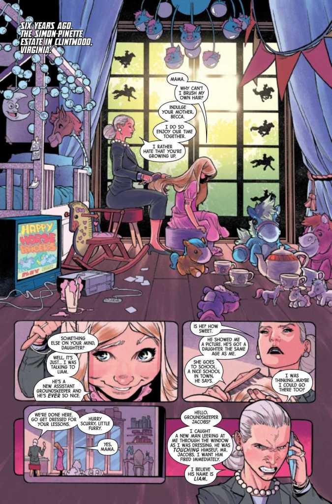In Uncanny X-Men #6, we begin with a brief flashback to Calico at home with her mother. Calico’s hyper-sheltered life under the thumb of her mother’s controlling influence is demonstrated in stark clarity when the mother orders the firing of a grounds worker who encourages Calico to go to school.