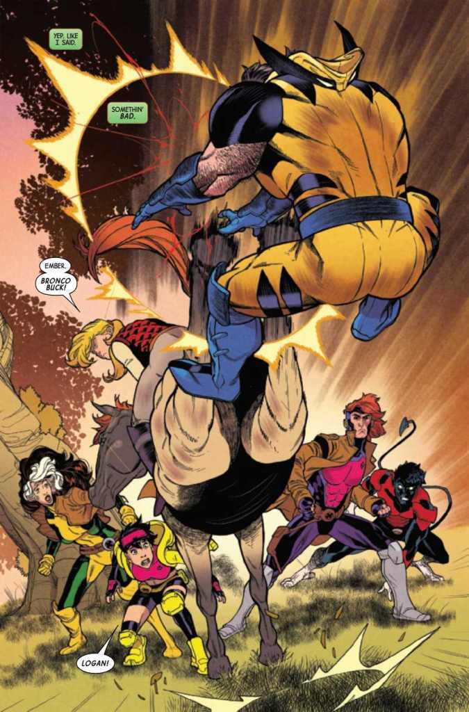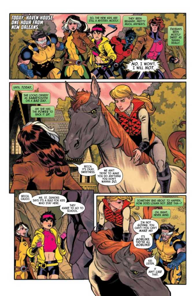 Now, Rogue, Gambit, and Wolverine gingerly try to get Calico to accept the obvious – she’s a mutant. Calico resists at first, ordering her horse to give Wolverine a good, swift kick, but Gambit offers to take the girl for a walk to help her ease into acceptance. Slowly, Calico agrees to accept what her mother (presumably) forced her to deny, and she’s elated over it.