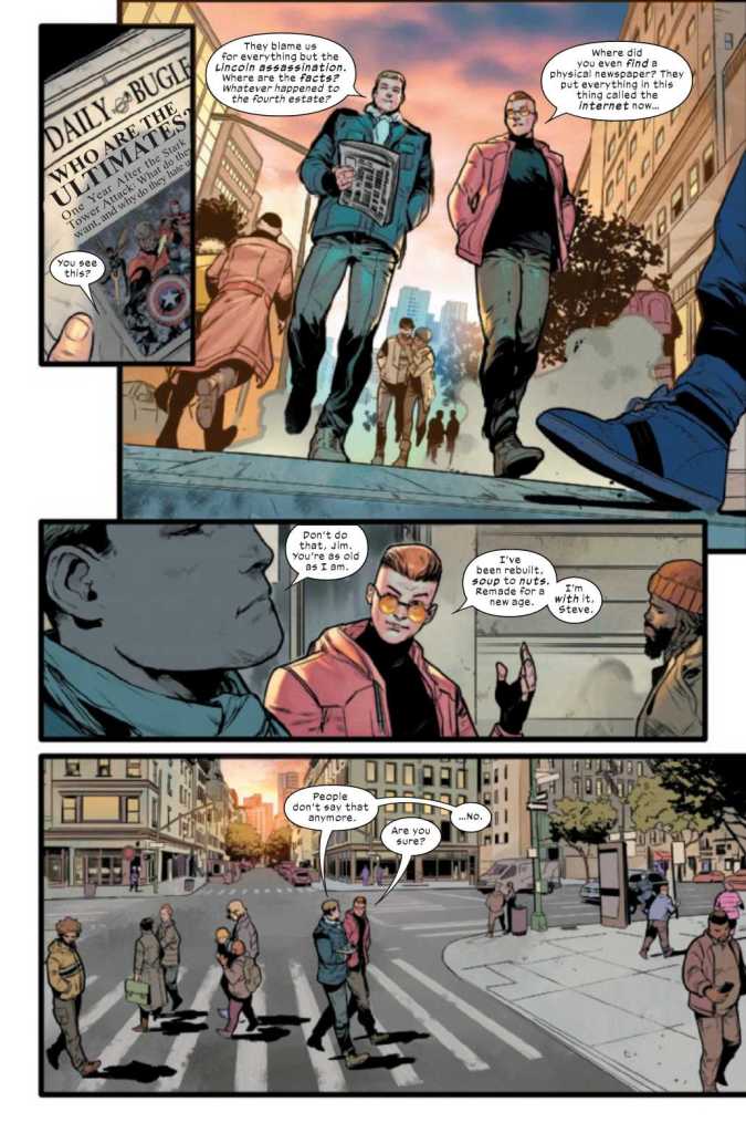 In The Ultimates #7, the Ultimate Avengers lay low after their defeat at the hands of Ultimate Hulk. The issue follows each Avenger, either in pairs or solo, to find out what’s occupying their time while they figure out how to proceed next. The issue takes place on the Memorial Anniversary of the attack on NYC, which took place in Ultimate Invasion #4 as a smokescreen to turn public opinion against Iron Lad, away from the Maker and his Council.