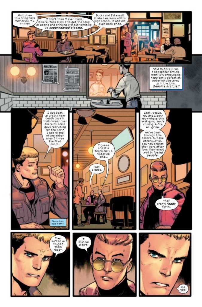 Steve Rogers, aka Captain America, and Jim Hammond, aka The (original) Human Torch, head to a real NYC landmark, McCorely’s Old Ale House. Along the way, Jim encourages Steve to step into the leadership role now that Tony is gone. When they reach the pub, they talk of changing times and punching Nazis. On television, Father Matt Murdock gives a speech at the Memorial about the evil of holding onto an ideology that fosters hate.