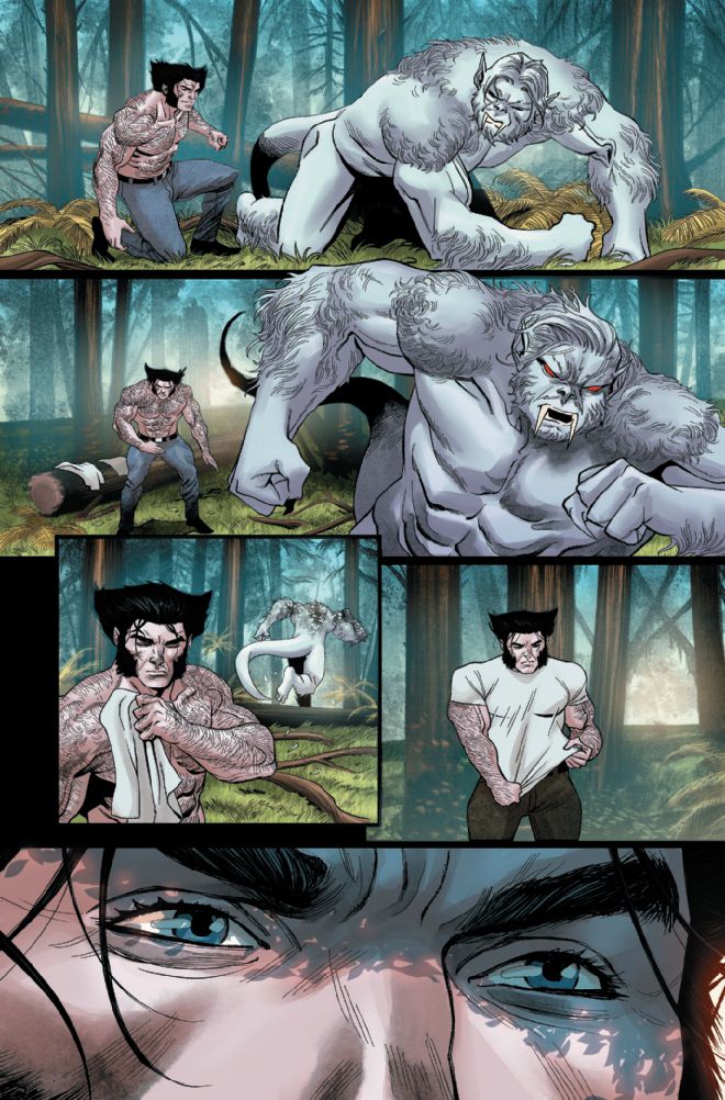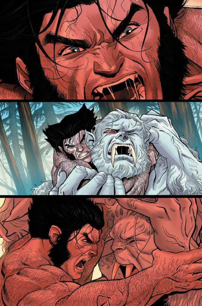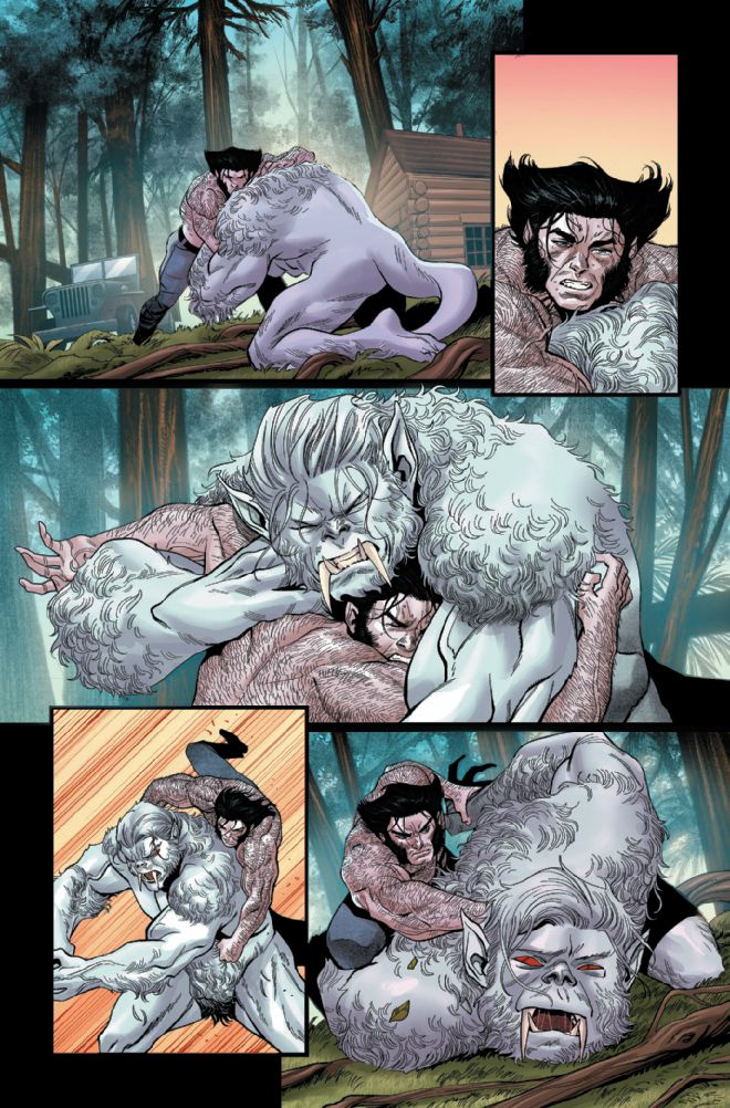 In Wolverine #4, we catch up with Logan in the middle of a sweaty, shirtless grappling match against Wendigo in the North American woods. We learn through Logan’s copious narration that he and Wendigo snuck across the Canadian border into America to avoid further manhunts from Department H. Isolated in a lonely cabin, Logan spends his days grappling Wendigo into saying his name and hunting for non-human meat.
