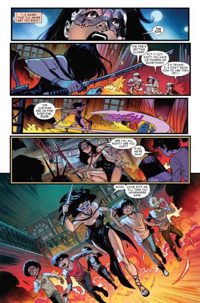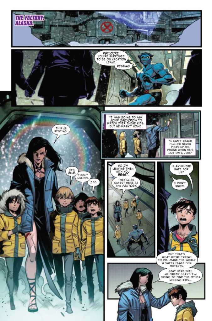 Psylocke attempts to free the kids, but she’s knocked out by an electrical blast from the security systems. When she wakes up, she’s in the middle of the ring, surrounded by powered kids who have orders to fight or die. The issue ends with a quick fight in and out of the ring, more refugees for Beast, and a gruesome calling card left for Kwannon at the Factory.