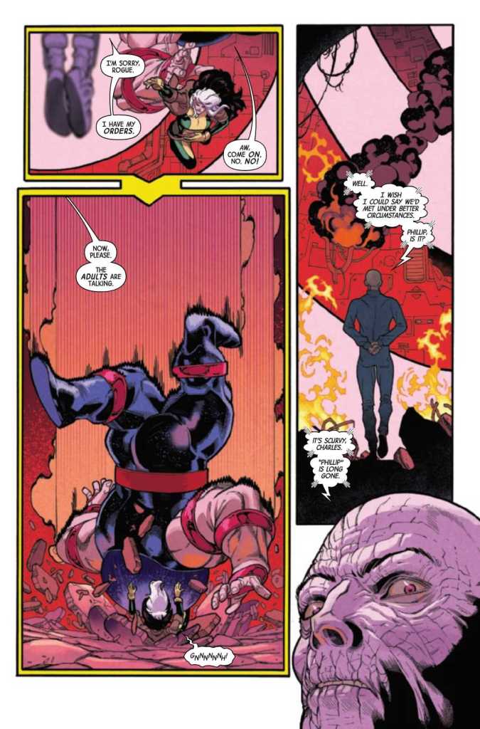 The issue and crossover ends with all mutants, including their captured teammates, leaving via Magik’s teleportation, Charles choosing to stay behind as penance for his misdeeds, and Rogue and Scott coming to blows before parting on bad terms.