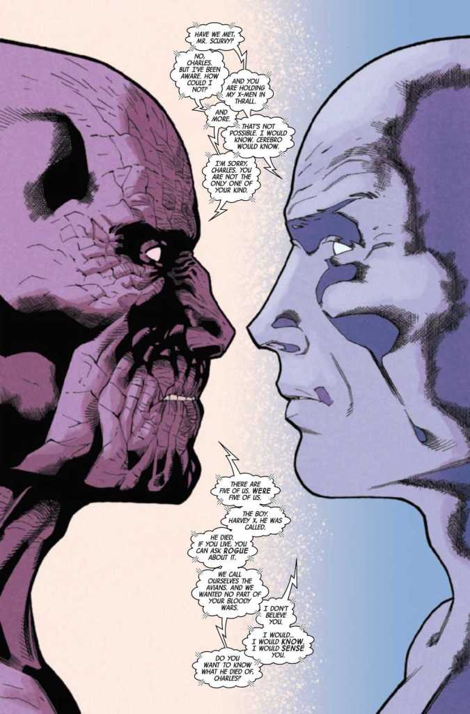 As their silent posturing commences, we see a brief flashback showing Phillip, aka Scurvy, before he became a withered husk. Phillip and Warden Ellis were friends and lovers at one time, but the continual use of his mutant powers ate away at his body. Scurvy explains there are five mega-mutants like himself in a group called the Avians, all with extraordinary power and all dying as a result. Harvey X (the boy who died in Uncanny X-Men #1) was another member of the five, but his death brings the number to four.