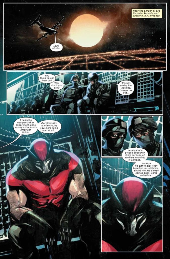 In a flashback, we see and hear that “Logan” came from the North American regions and was captured after a bombing raid between the Eurasian Republic and the rebel group known as The Opposition. Logan was brought to the Eurasian Republic Leaders – Colossus, Magik, and Omega Red – for conscription, brainwashing, and experimentation within their Directorate X program. Logan was subjected to their bone enhancement procedure that gave him unbreakable bones, and he was redubbed the Winter Soldier.