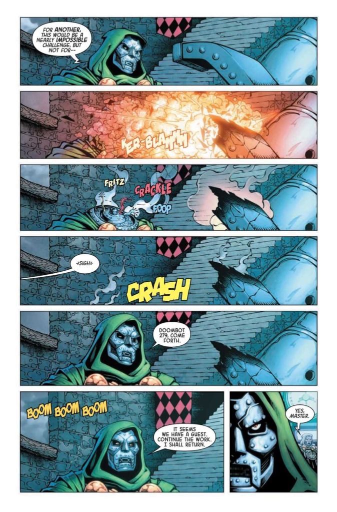 Doctor Doom & Rocket Raccoon #1 begins with Doctor Doom overseeing his Doombots as they work through the creation of a special device. The work goes well up to a certain point, but the build repeatedly ends in explosive disaster. One rainy night, Rocket Raccoon arrives in response to Doom’s summons and with the promise of a hefty fee to lend his technical genius.