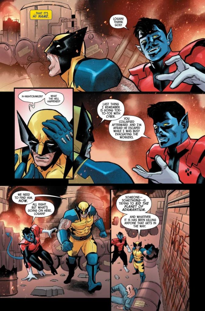 Nightcrawler uses the scanners aboard the Blackbird to discover Cyber, Lady Deathstrike, and Constrictor are attacking a Data Center housing digital files on Adamantium processing. The Blackbird is too damaged to fly, so Nightcrawler BAMFs Wolverine and X-23 to the location in Arizona (Can Nightcrawler BAMF that far to a location he’s never seen?). When the trio arrives, Wolverine asks Nightcrawler to go back and keep an eye on Wendigo.