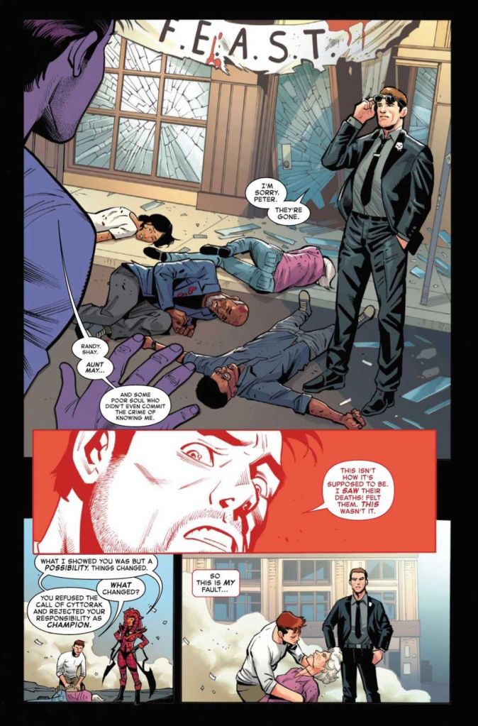 How? How did Justina Ireland and Joe Kelly come up with a plot this boneheaded?!? The entire crux of this issue depends on Peter snapping out of his doldrums by seeing the death of his friends and family, but Cyra already showed him the future deaths of his friends and family. When he questions why they’re different, she says circumstances have changed, but the circumstances that changed had nothing to do with Peter’s actions or inactions. It’s all Callix. What on Earth is this plot hole? How many random developments are readers supposed to endure?