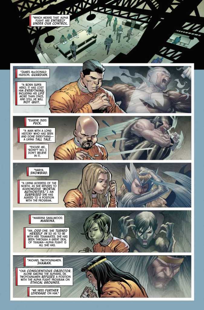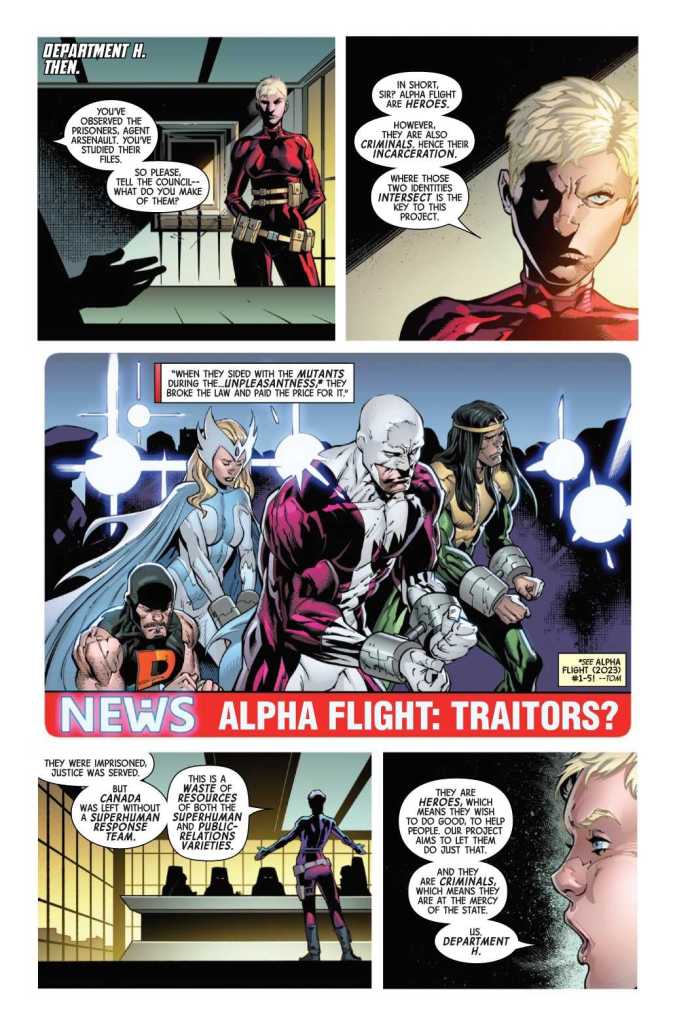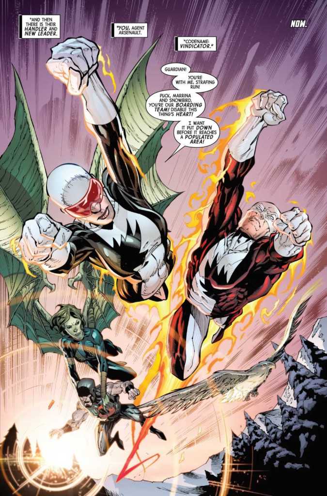 Alpha flight arrives under the strict probationary control of Department H because they’re still technically prisoners (see the 2023 Alpha Flight miniseries very few people actually read) to assist with alien hostiles in Canadian airspace. Guardian and the new Vindicator work with Temper to slow the mercenary ship down. The rest infiltrate the ship, disable the whale’s hearts, and teleport to safety as the ship crashes.