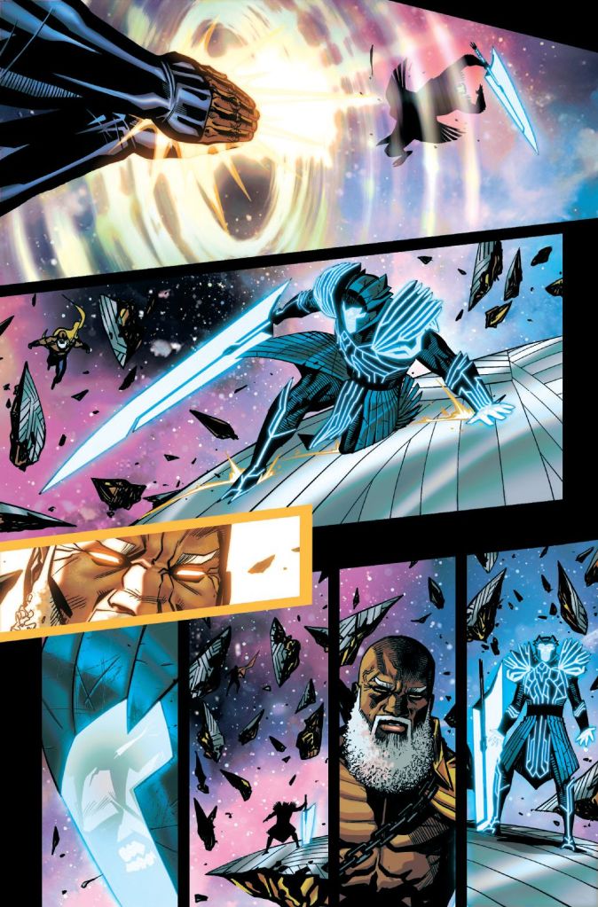 When we last left the uber-powered Luke Cage from a future that no longer exists in Power Man: Timeless #1, Luke sped his way to Earth (or some version of it in the present) to stop Danny Rand from becoming a destroyer of worlds in the future. Luke’s travels were interrupted when he crossed paths with a world-killer named Aeon the Knife in pursuit of a woman named Ever, who lives in the Celestial Heart on Jupiter. Luke evaded Aeon temporarily, but the second match commenced when Aeon destroyed the Celestial Heart.