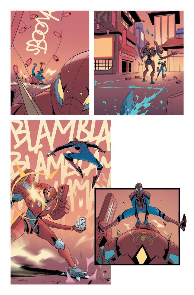 Spider-Zero’s team, led by Peni Parker in a mech suit, races to get to Stark-Fujikawa building to connect the Web Of Life And Destiny into Cyberspace, while Master Weaver’s team, led by Spider-Man, fights to stop them. As the fight and race proceed, old alliances are severed, new alliances form, relationships are tested, and families are found. In the end, the teams find a solution that combines both theories to restore the Web.