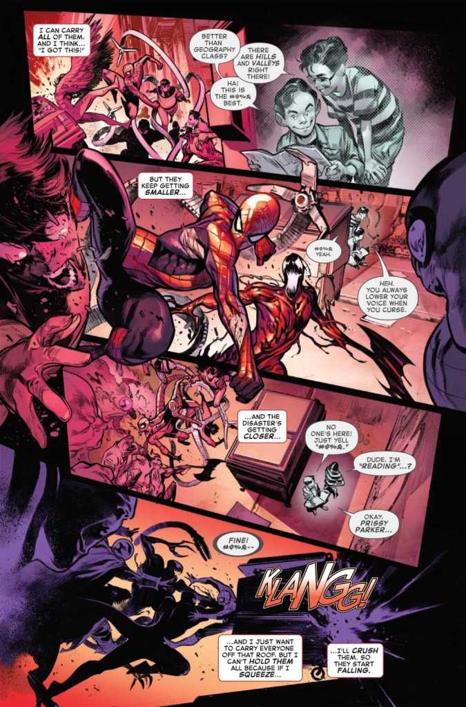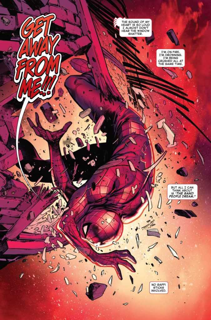 Pepe Larraz looks like he’s having a blast with weird panel progressions and off-kilter layouts meant to reflect Spidey’s disorientation during his hallucination trip. But here’s the kicker. The way the panels are arranged, drastically helped by Joe Caramagna’s coloring, makes the fever dream of imagery a breeze to follow. The action looks great, even if it is all in Spidey’s head.