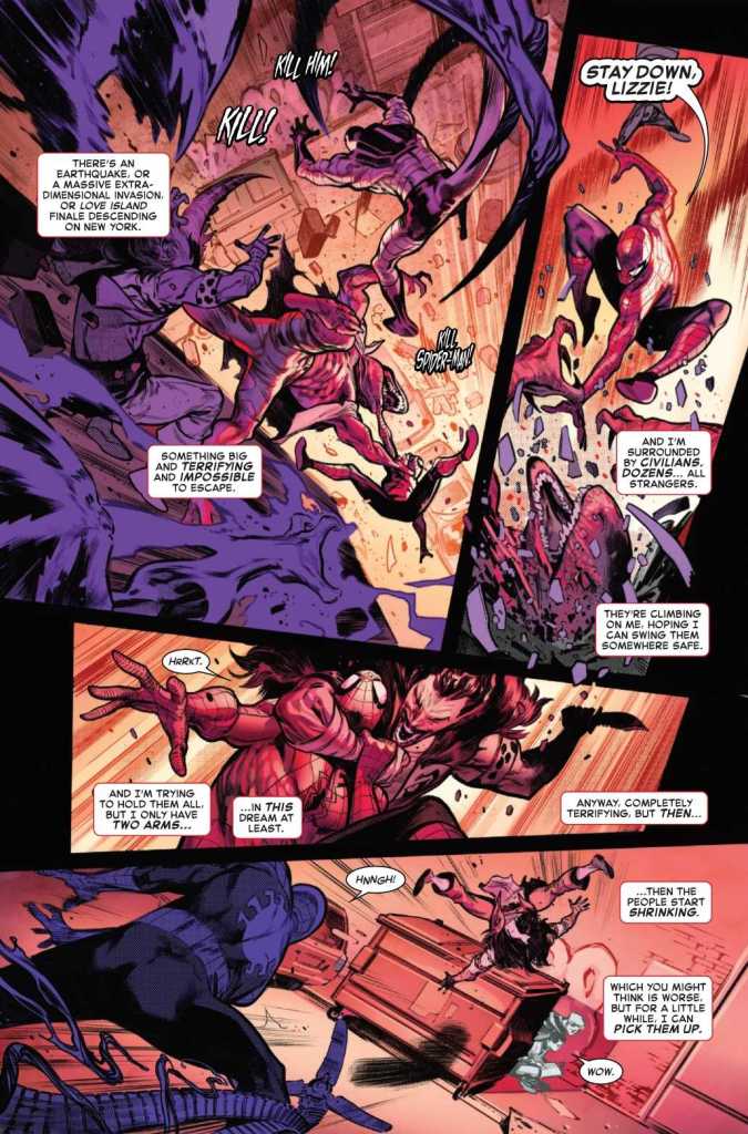 Plus, Joe Kelly hand waves a few too many details that help Spidey along the path to solving the mystery. Norman jumps to the conclusion that Spidey was poisoned by gas with no evidence at all. Spidey assumes Rhino is the key to everything when he already knows from Randy that multiple families in the area are affected. And Spidey happens to show up at Ravencroft at just the right time to catch Itsy Bitsy by surprise. We can suspend disbelief at one assumption or coincidence, but too many are stacking up.