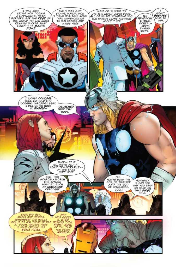 In One World Under Doom #3, the humiliation of Earth’s Mightiest Heroes continues. We begin with the unveiling of the plan teased at the end of the last issue. The Avengers invited a group of longtime Avengers villains to the Impossible City – including Arcade, Goblin Queen, Dr. Octopus, Baron Mordo, Scarlet Witch Mysterio, and MODOK – for a strategy session. What’s the plan? Attack Doom in Latveria (again) as a distraction. While Doom is busy, the magical members of the group will secretly accost several world leaders and tap into their minds to find out what Doom did to them to get them to give up control.