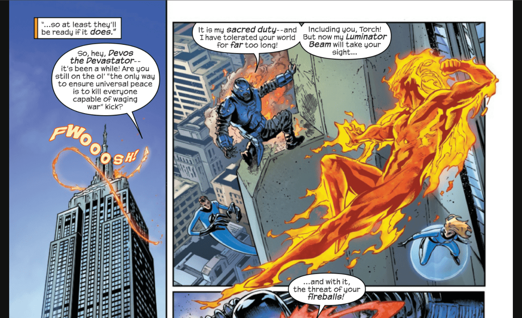 Next, we switch scenes to a fight between Devos the Devastator, Johnny, Sue and Reed. It’s high up on top of a skyscraper. Johnny’s powers suddenly fade and he’s falling like a stone. Luckily Reed is there to catch him in his stretchy hands. Sue deals with Devos and they’re safely back on the ground. Worried about his reputation, Johnny makes sure Devos hears him saying, “Ha ha! You fell for the ol’ ‘I lost my powers’ trick, Devos!” Like it was deliberate. Sue rolling her eyes in the background made me laugh here.
