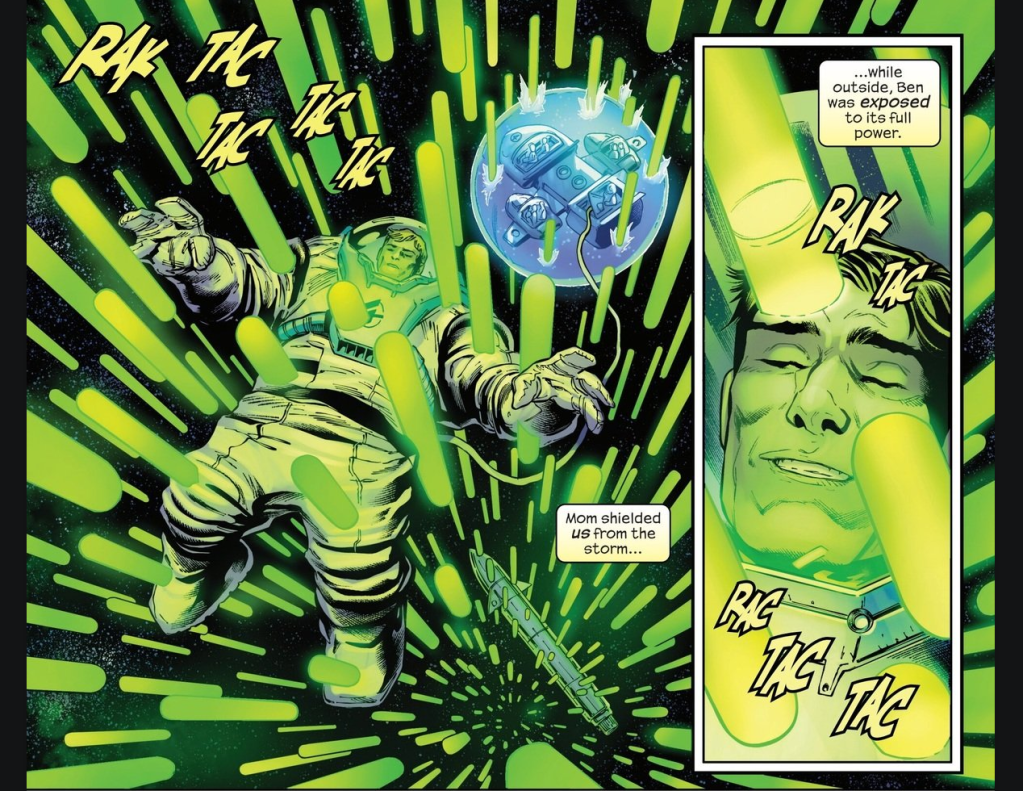Well, Ben Grimm wants his powers back, not just for himself but also because he’s worried about how it’ll affect the other family members’ powers. If one of them loses their powers, the rest could become powerless, too. It has happened before. There’s an editor’s reference to Chip Zdarsky’s Marvel 2-in-One here. But Alicia reminds Ben that it was probably due to Reed and Sue being in a different universe at that time. I’m getting a bit lost here, folks. Are you still with me? Okay.