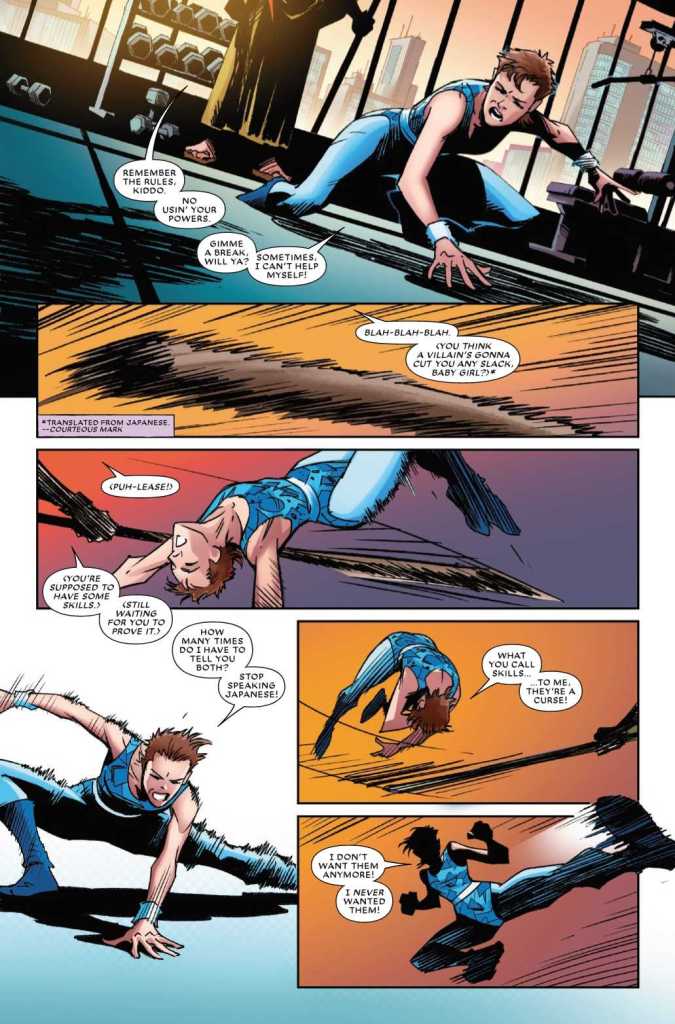 Later, Kitty attends school with Mariko’s daughter, Amiko, to return to some semblance of a normal life. When their girls and their schoolmates walk down a side street, they’re attacked by kidnappers named Kill, Snare, and Getaway. Let’s call them the Verb Gang. The kidnappers try to stuff one of the boy students into the back of a truck, but Kitty easily intercepts the attack and frees the boy. Kitty holds the attackers off long enough for Wolverine to arrive and join the fight. He opts not to use his claws while the kids are present, so he bats the Verb Gang to a pulp, thanks to help from Kitty and Amiko.