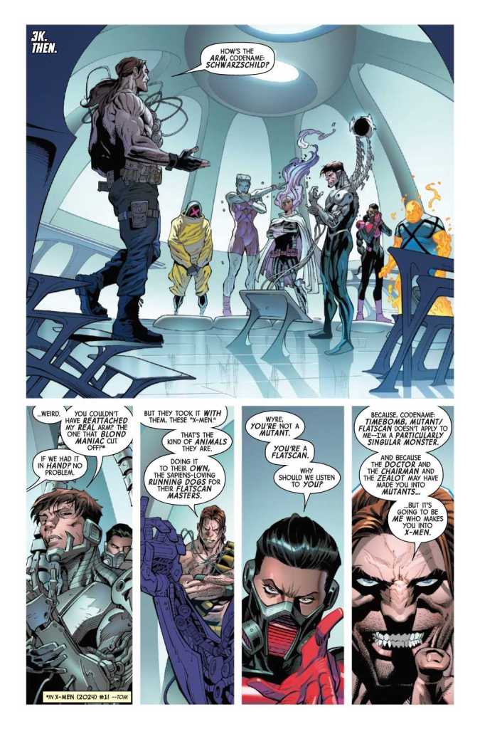 In X-Men #16, the battle expands onto two fronts. Scott and the field team are immediately attacked by this new group of mutants calling themselves the X-Men. In a brief flashback, we learn the team is the Santo Marco Six – a group of adults with activated mutant powers via the technological intervention of 3K (see X-Men #1). To become the new face of mutant strength, the Santo Marco Six must prove themselves in battle.
