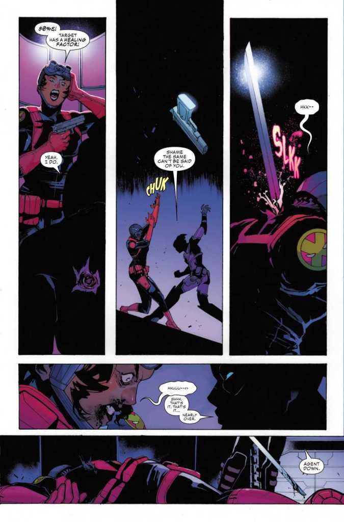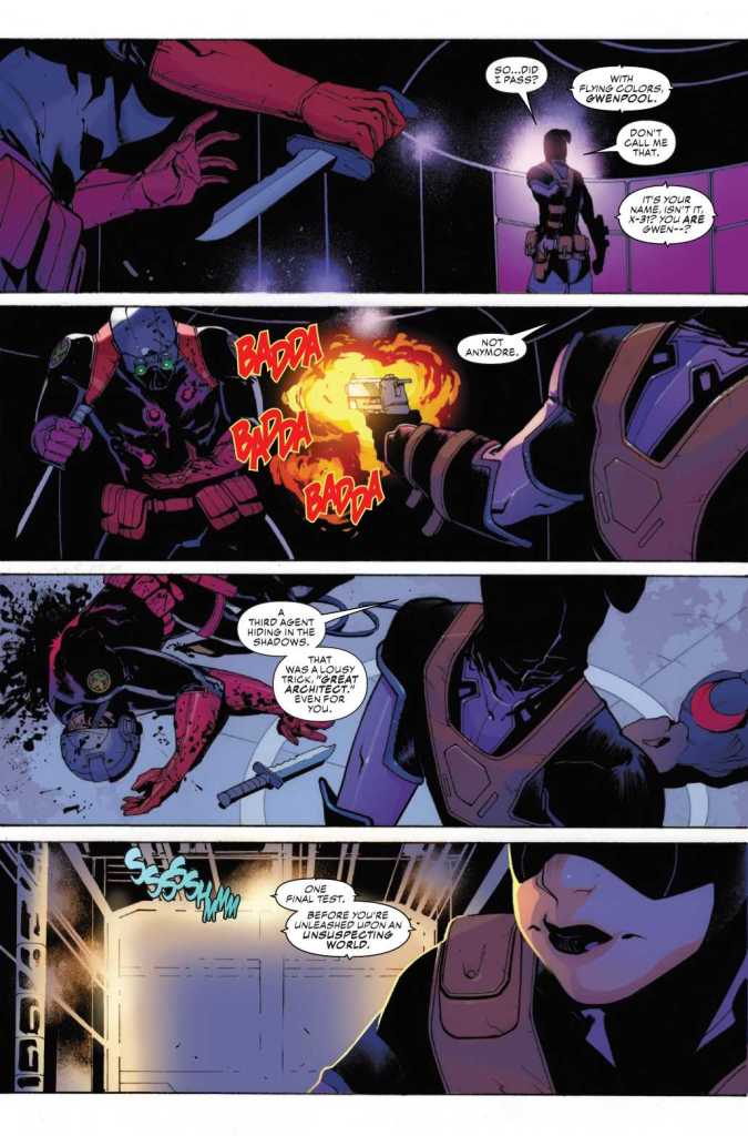 We begin with a brief mission prologue as a group of agents infiltrate Weapon X Facility Beta. The agents are quickly mowed down by a darker, edgier version of Gwenpool as a readiness test. Then, Dark Gwenpool’s handler sends her off to her next test – to take down a trio of Deathloks.
