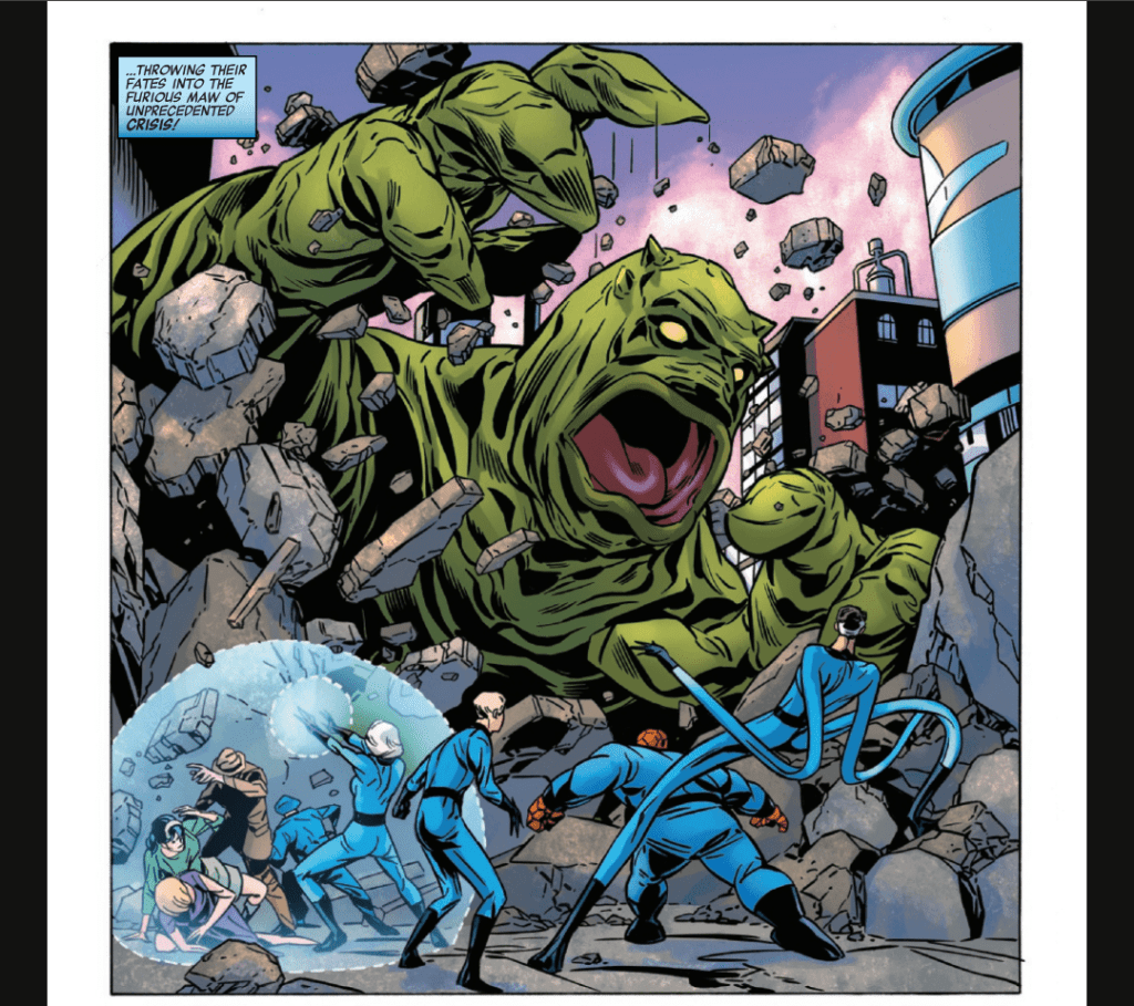 The scene shifts to midtown Manhattan where the Mole Man and his Moloid marauders have launched a full-scale attack on the surface dwellers. Marvel’s first family takes a fantastic flight in the Fantasticar to the Big Apple and are greeted by an excited press. We’re reminded that this is their first public appearance after their cosmic “accident” and quarantine. But they don’t get any time to pose for photos as a giant green monster bursts out of the ground, referencing the classic cover of the very first issue by Jack Kirby and Stan Lee.